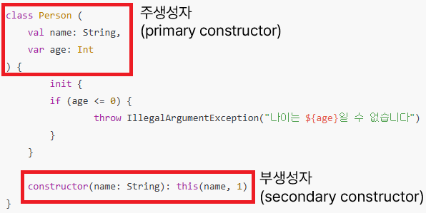 - 코틀린에서는 constructor 키워드를 사용해 부생성자를 추가로 만들 수 있다.